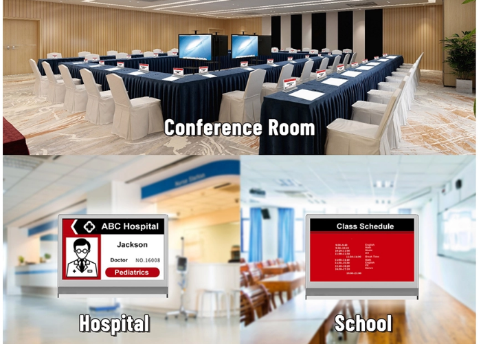 Với các bảng tên điện tử trong phòng họp, được áp dụng 2 màn hình với 2 chế độ hiển thị khác nhau: mặt trước có thể hiển thị tên, chức danh; mặt sau hiển thị thông tin đọc gần.
