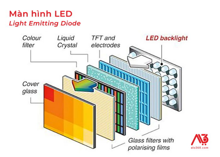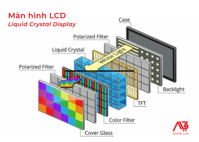 Màn hình LCD gồm 6 lớp chính được sắp xếp chồng lên nhau, mỗi lớp đảm nhận một chức năng riêng để đảm bảo hình ảnh hiển thị sắc nét và màu sắc trung thực. Cụ thể: